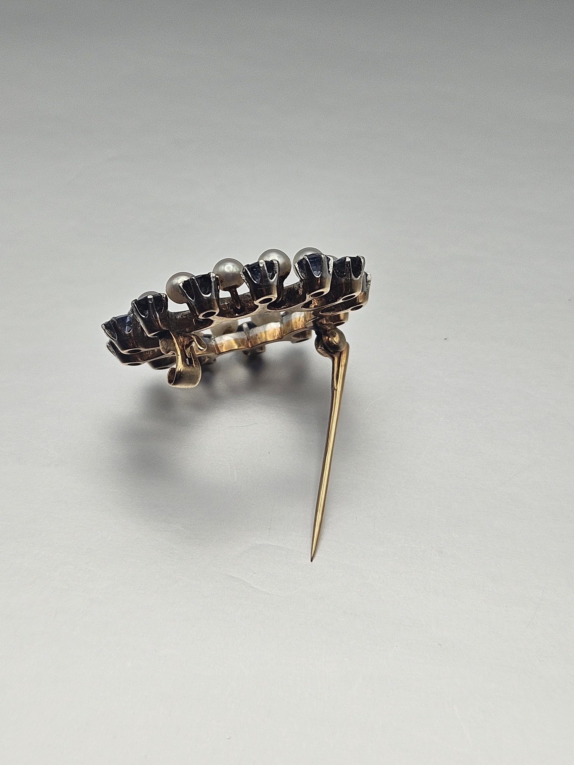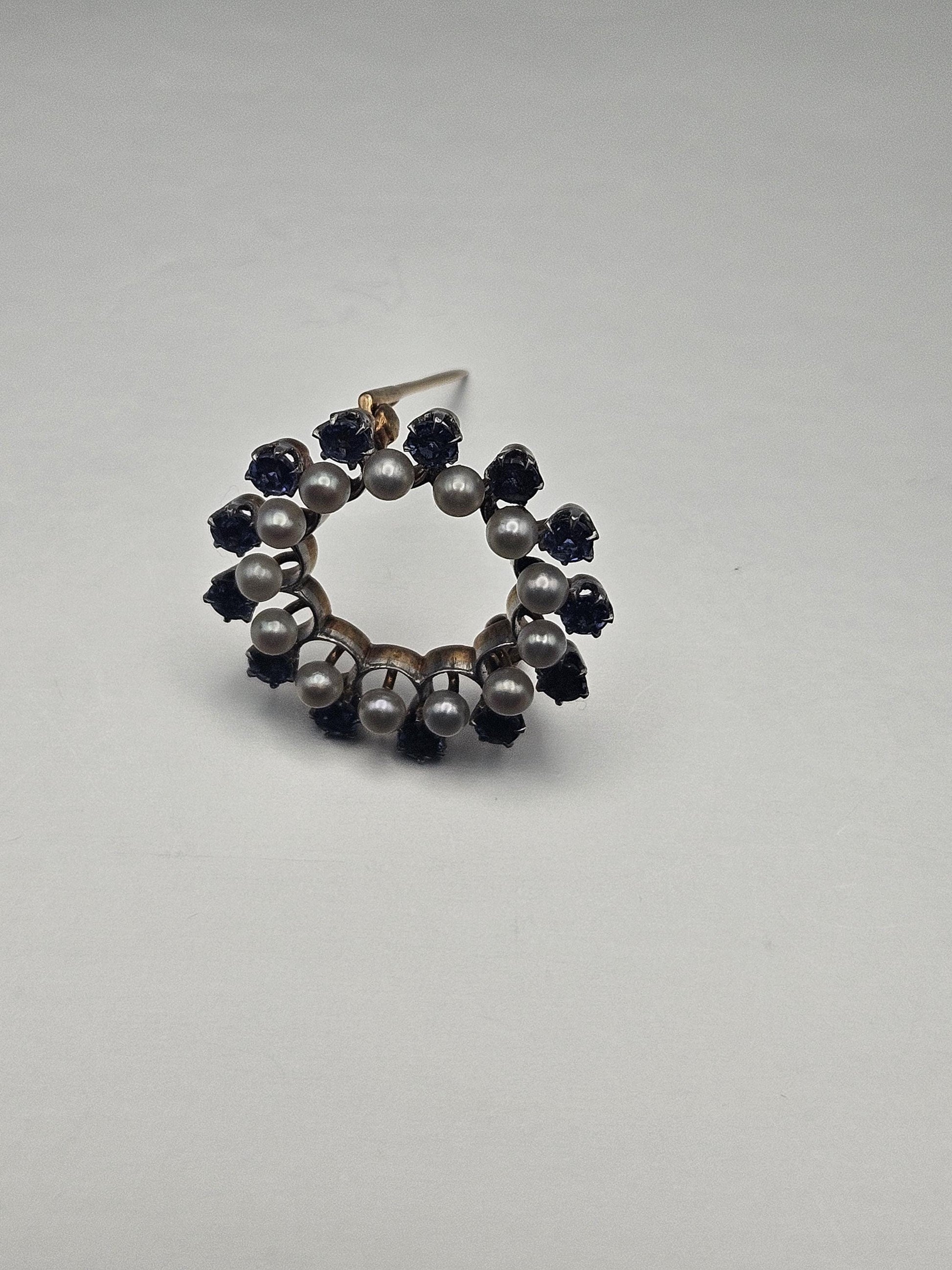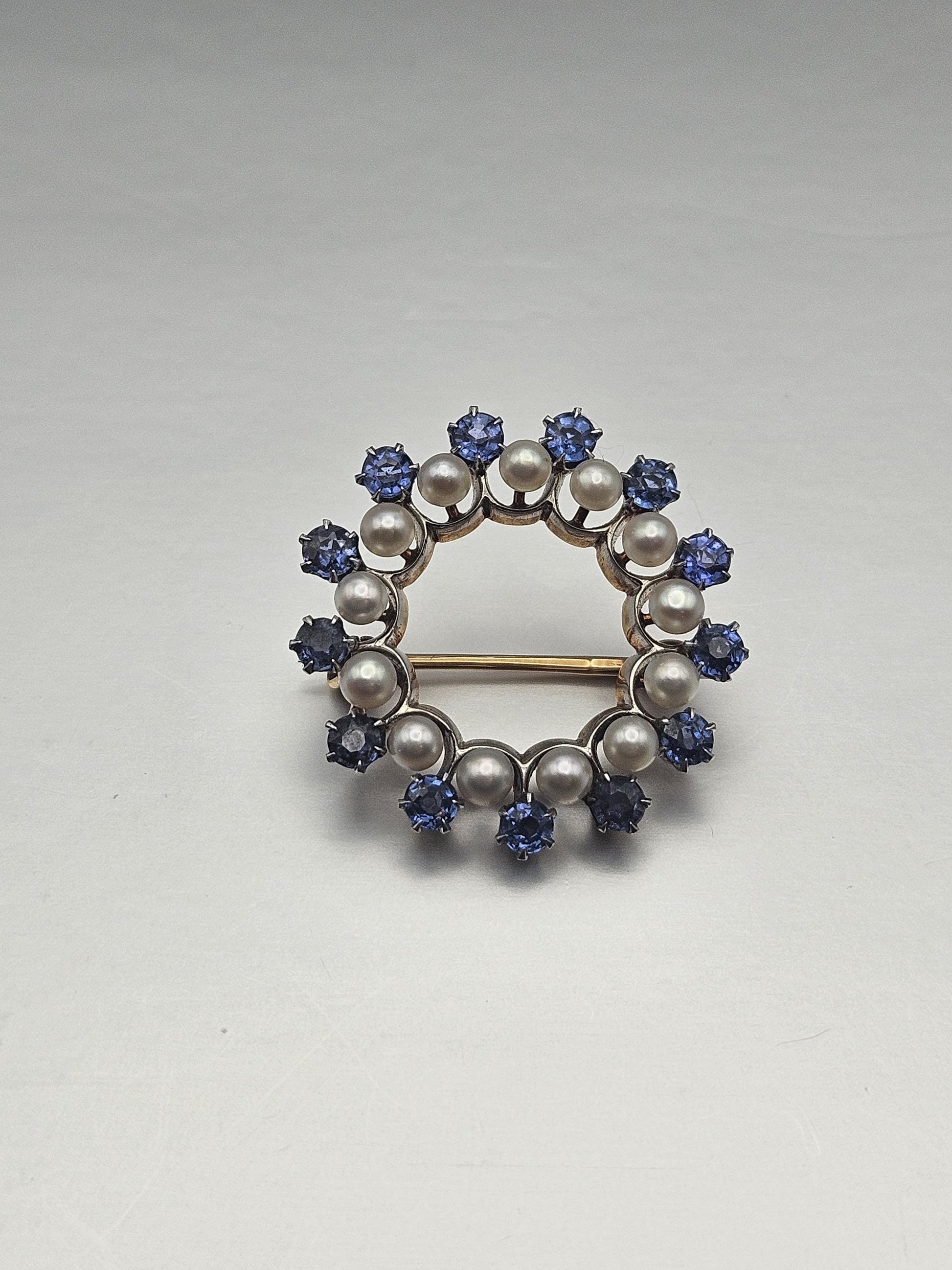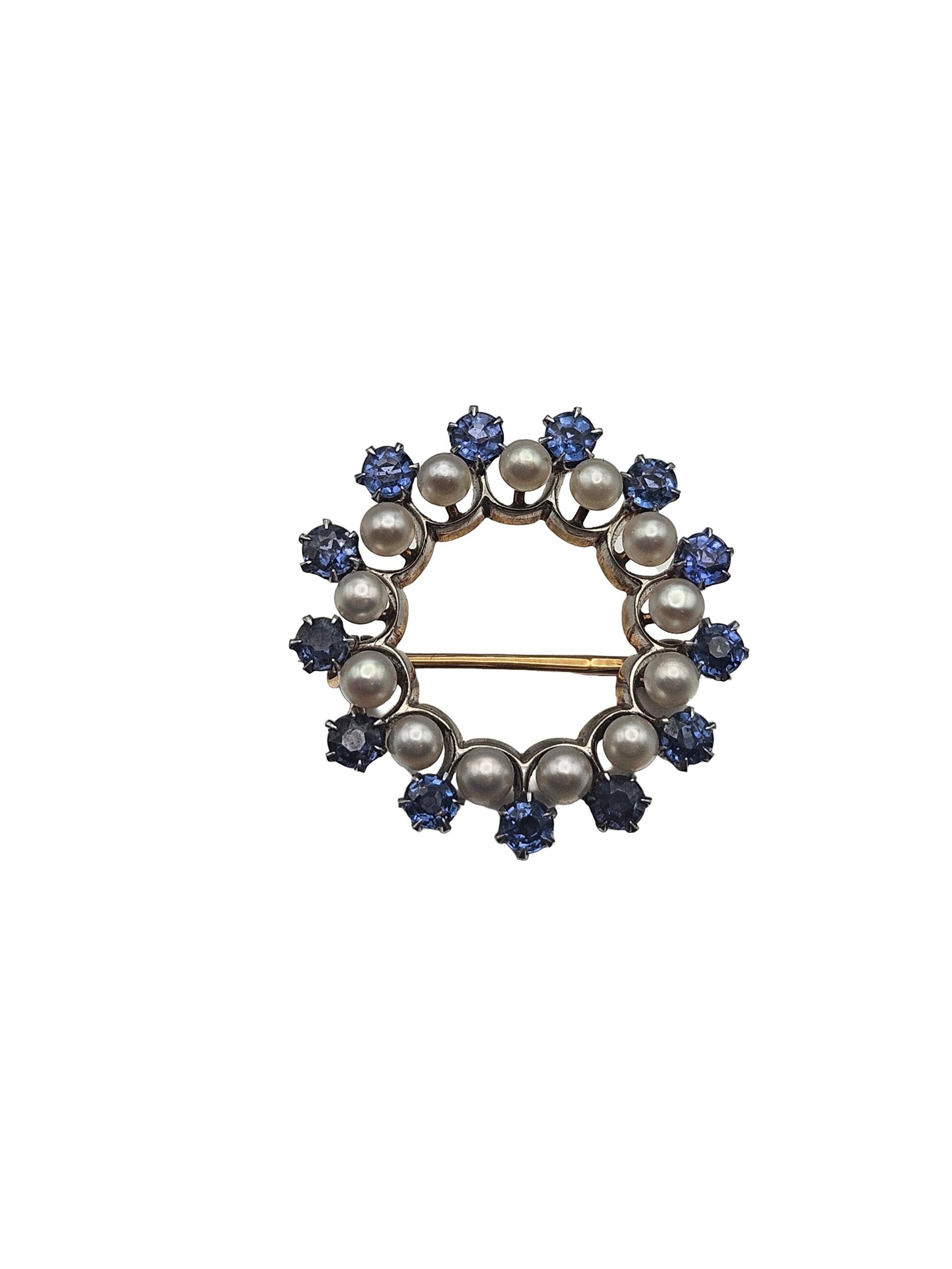 14k Gold Pin Brooch Vintage Sapphire Pearl Round Pin, Yellow Gold and White Platinum Brooch, Charm Brooch Vtg, Gift for her