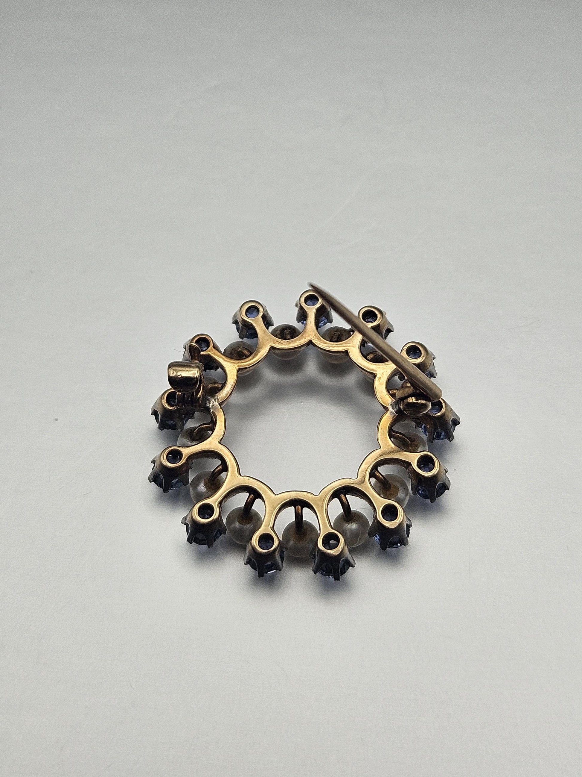 You will get as pictured one vintage 14k solid yellow gold which white platinum pearl and sapphire circle pin broch.