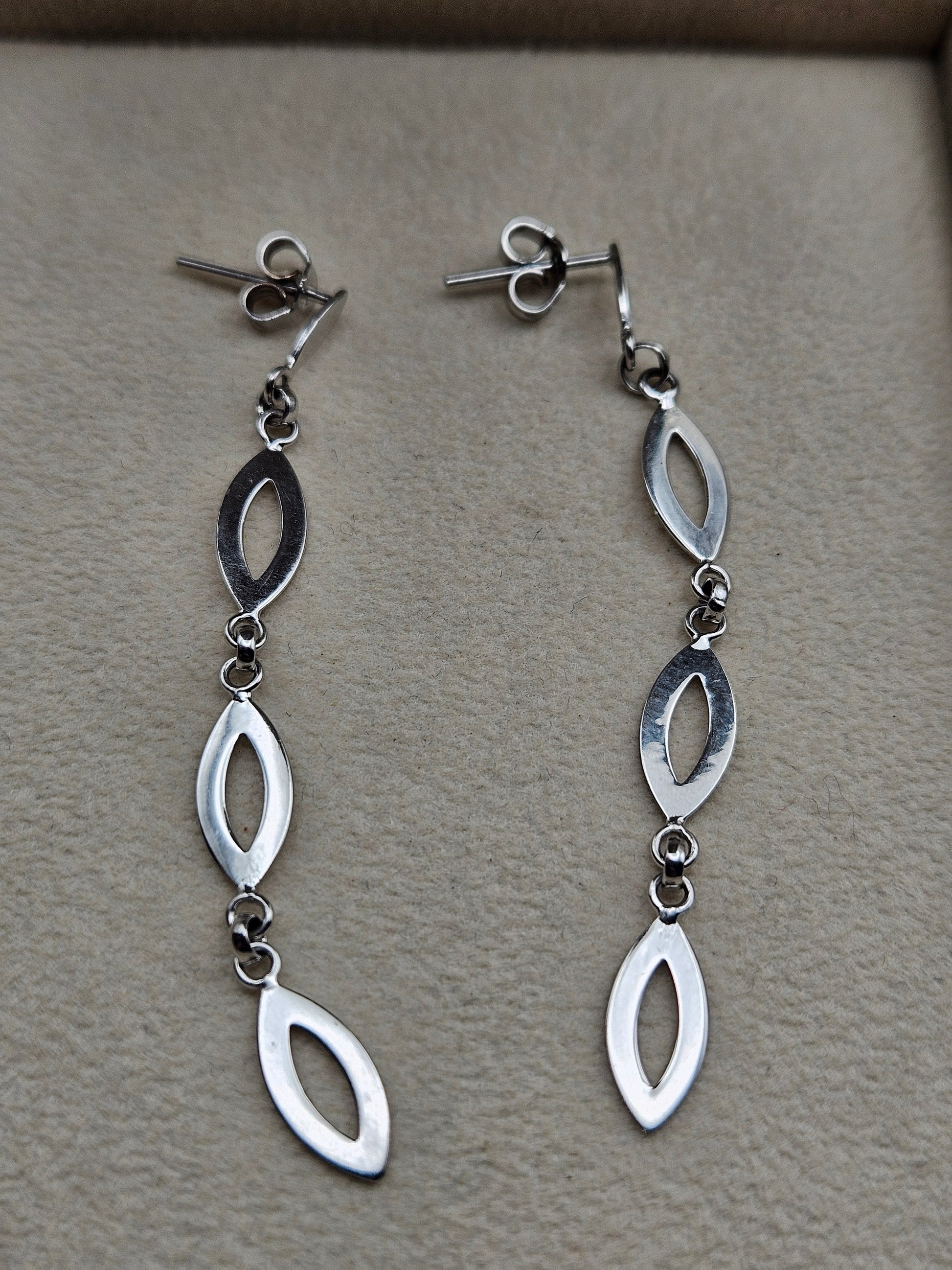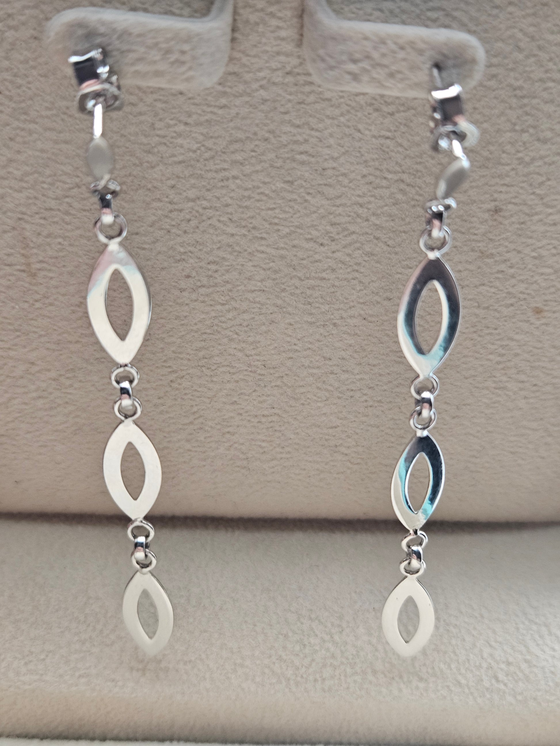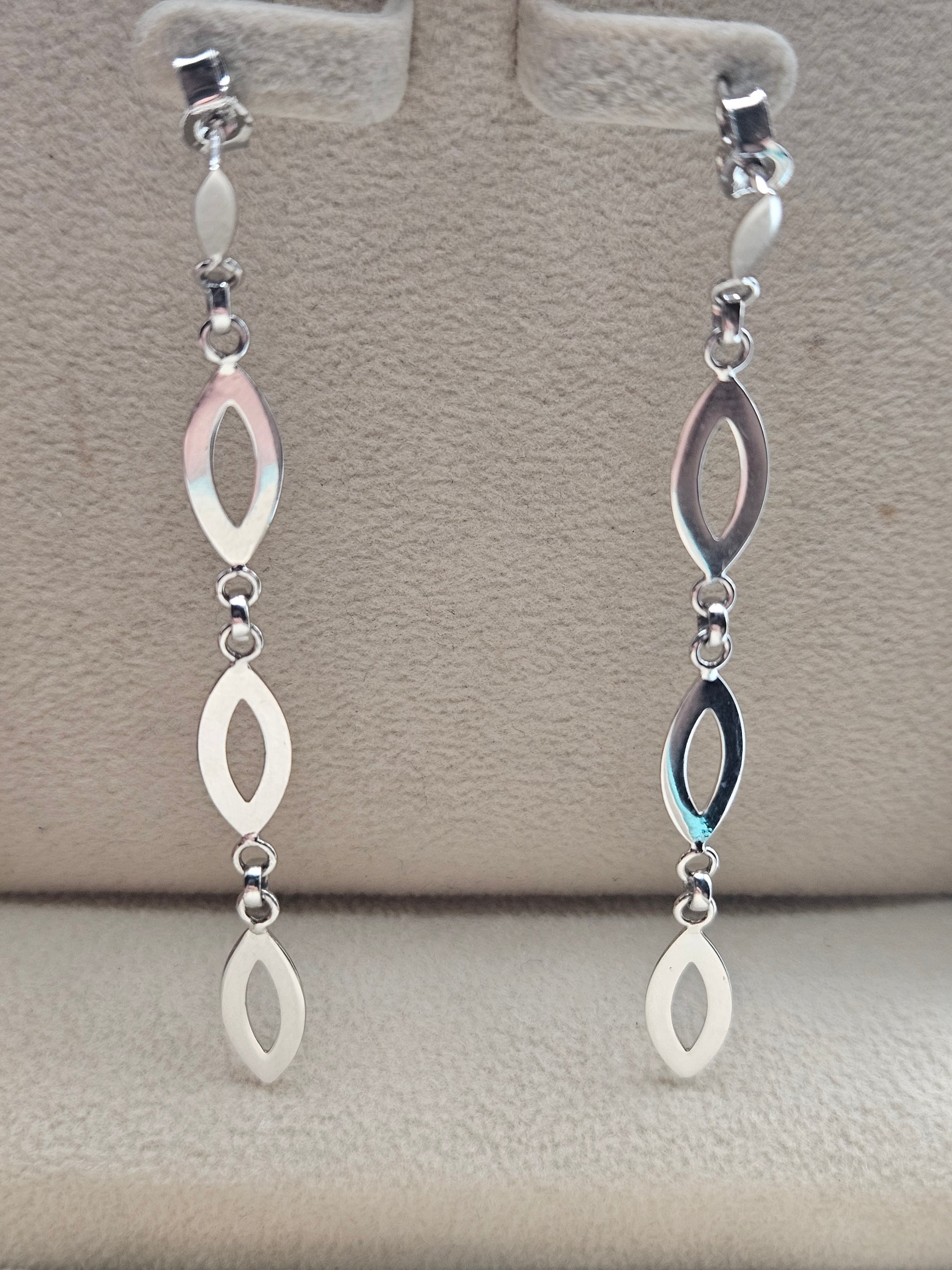 Add modern elegance to your jewelry collection with these stunning 14K white gold drop earrings. Designed with sleek open marquise links, these earrings create a graceful, lightweight movement that catches the light beautifully with every turn. Their polished white gold finish gives a luxurious shine while remaining subtle enough for everyday wear.